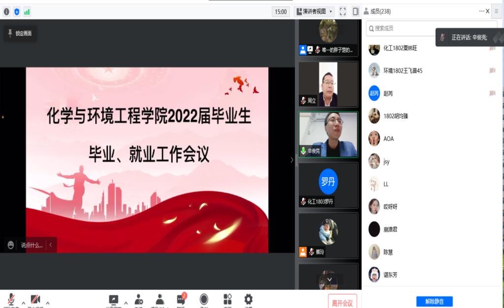 为扎实推进2022届毕业生的毕业、就业指导工作,4月18日晚7点,化学与环境工程学院以网络视频会议的形式,组织召开了全体2022届毕业生毕业、就业工作会议。院党委书记周立,党委副书记、院长辛俊亮,院党委副书记蔡玲,副院长黄俊歆,副院长刘宁,全体辅导员及毕业班班主任,毕业设计指导老师,全体2022届毕业生参加了本次会议,会议由院党委副书记蔡玲主持。