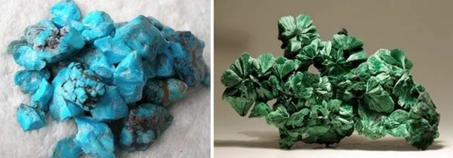绿松石,一种含水的铜铝酸盐类矿物,化学式为CuAl6(PO4)4(OH)8·5H2O绿松石因所含元素的不同,颜色也有差异,氧化物中含铜时呈蓝色,含铁时呈绿色。多呈天蓝色、淡蓝色、绿蓝色、绿色、带绿的苍白色。颜色均一,光泽柔和,无褐色铁线者质量最好。