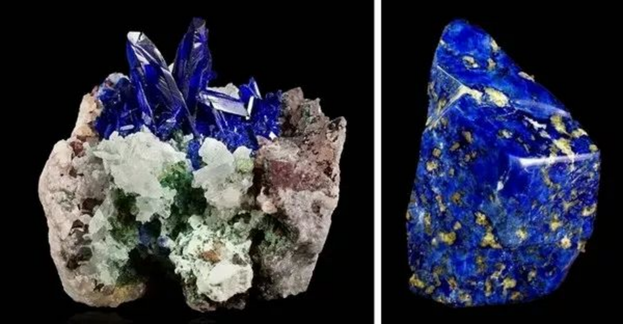 青金石:由于对矿物青金石研究目前尚未透彻,所以对其化学式有其他一些不同的写法,有的指碱性铝硅酸盐矿物,化学式为:(Na,Ca)7~8(Al,Si)12(O,S)24[SO4,Cl2(OH)2]为玻璃至油脂光泽,拥有独特的蓝色、深蓝、淡蓝及浅青色等。有的认为化学式为(NaCa)8(AlSiO4)6(SO4,Cl,S)2此时矿物为等轴晶,呈现出暗蓝、蓝紫、天蓝、浅蓝或绿蓝色。