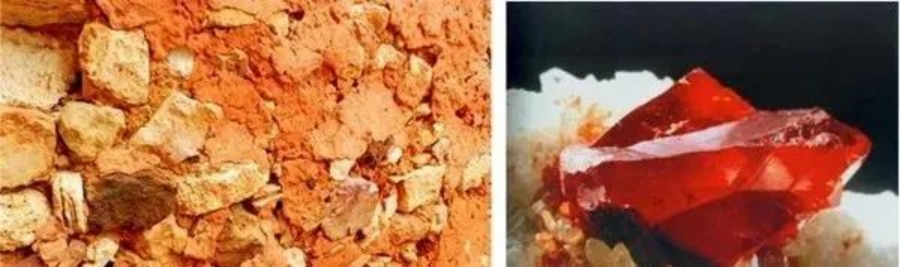 朱砂,是硫化汞(HgS)矿物。颜色常呈红色,晶体表面具条痕红色,半透明。纯净辰砂为金刚光泽,朱红色;含杂质时光泽暗淡,褐红色。