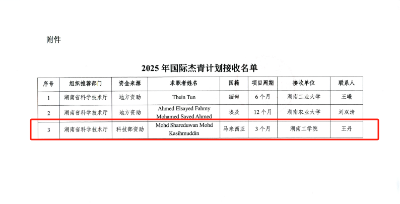 近日,科技部国际合作司正式公布2025年度第一批“国际杰青计划项目”接收名单,永利马来西亚籍Mohd Shareduwan MohdKasihmuddin脱颖而出,成为本年度湖南省首批立项的三个项目之一。这是永利继2024年获批3人实现该项目“零的突破”后,在该项目上实现了2025年度的开门红。(文/王丹 肖亚斌 审稿人/一审:彭婷 二审:彭国柱 三审:肖中云)