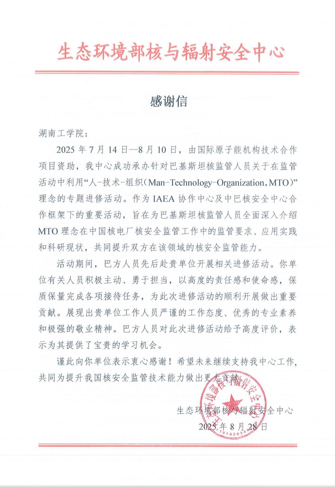 近日,生态环境部核与辐射安全中心向永利发来感谢信,对永利承接针对国际原子能机构(IAEA)技术合作项目资助学员的培训表示感谢,并对永利工作人员严谨的工作态度、优秀的专业素养给予高度肯定。接受培训的巴基斯坦核监管工作人员对在永利的进修活动高度评价,表示为其提供了宝贵的学习机会。