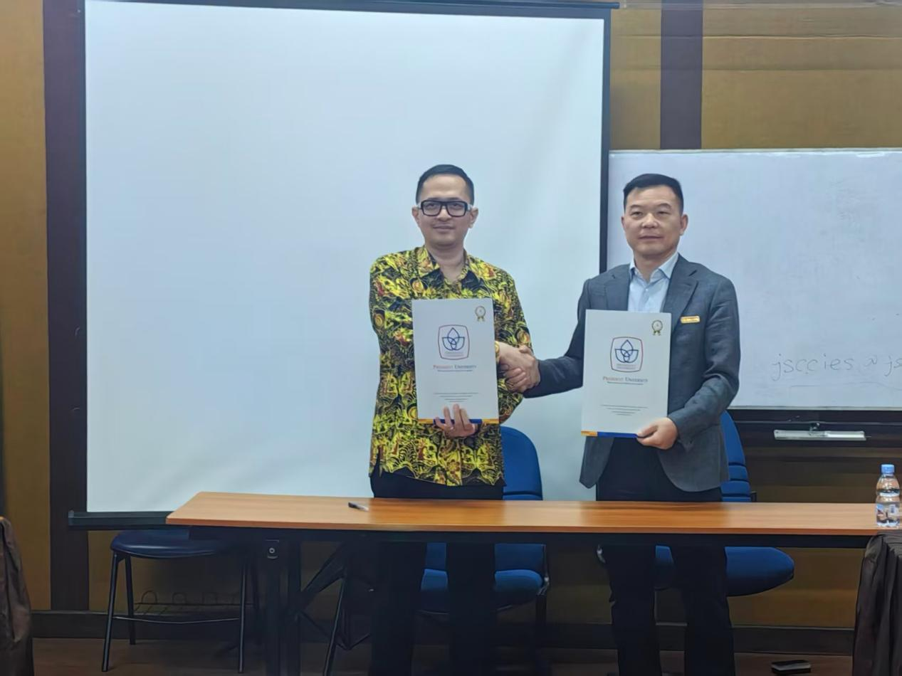 在印度尼西亚总统大学,代表团与该校校长Handa S. Abidin, S.H., LL.M., Ph.D.、副校长Prof. Dr. Ir. Chairy, SE., M.M.及相关学院负责人进行座谈。双方围绕师生互访、学分互认及联合科研等内容达成合作意向,并共同签署了合作备忘录(MOU)。代表团还调研了该校实验室建设与产学研融合经验。