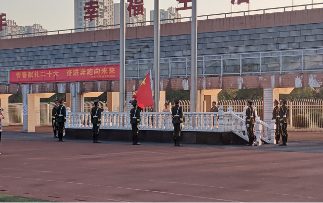 10月17日上午7点,化学与环境工程学院在北运动场举行了以“青春献礼二十大,奋进奔跑向未来”为主题的升旗仪式。学院党委书记周立,院长辛俊亮,党委副书记蔡玲,副院长黄俊歆,副院长刘宁,组织员谭斌,教科办主任刘赛,全体辅导员及新生班主任老师出席,全体学生参加。本次升旗仪式由学工办主任兼分团委书记陈凌霄主持。