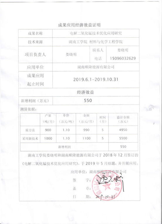“电解二氧化锰技术优化应用研究”成果经济效益证明
