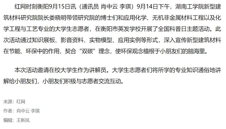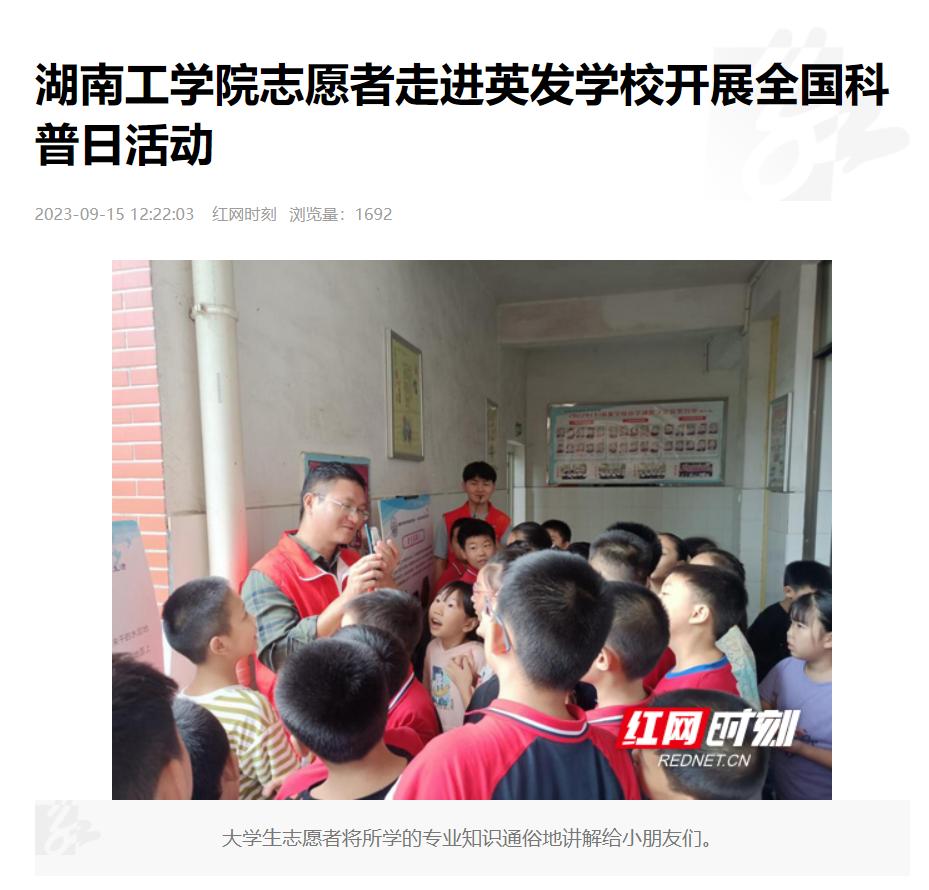 红网时刻:304永利集团官网志愿者走进英发学校开展全国科普日活动
