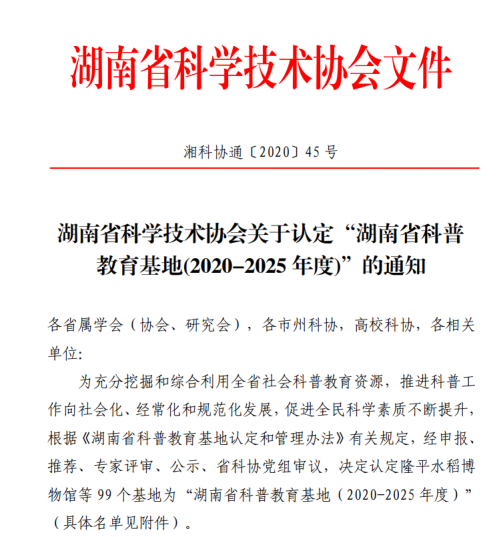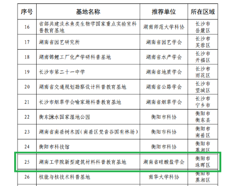 根据湘科协通[2020]45号文件《湖南省科学技术协会关于认定“湖南省科普教育基地(2020-2025年度)”的通知》,由新型建筑材料研究院申报的《304永利集团官网新型建筑材料科普教育基地》被认定为“湖南省科普教育基地”。