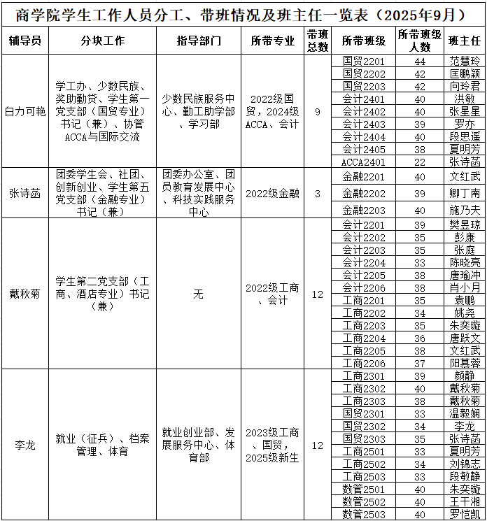 商学院学生工作人员分工、带班情况及班主任一览表 (2025年9月)