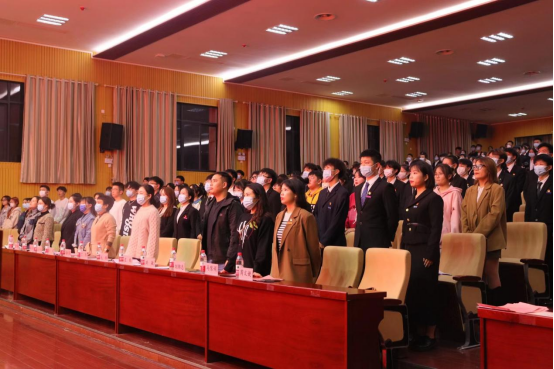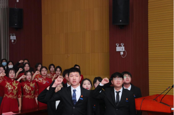 迎院旗,第十四届团委、学生会团委副主席刘霞与第十五届团委、学生会团委副主席曾涛进行工作交接。曾涛作就职演讲并带领新一届团学全体学生干部进行就职宣誓。