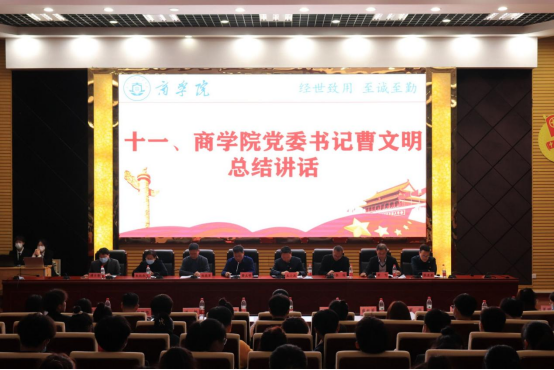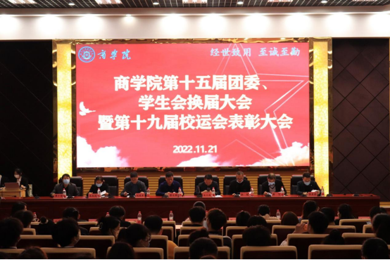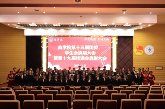 启航新征程,扬帆再出发。11月21日晚,商学院在学校明翰报告厅举行第十五届团委、学生会换届大会暨第十九届校运会表彰大会。商学院党委书记曹文明、院长王小兵及全体院领导、辅导员、教研室主任、实验中心主任、学生代表及各学院团学代表参与此次大会,会议由张诗菡主持。