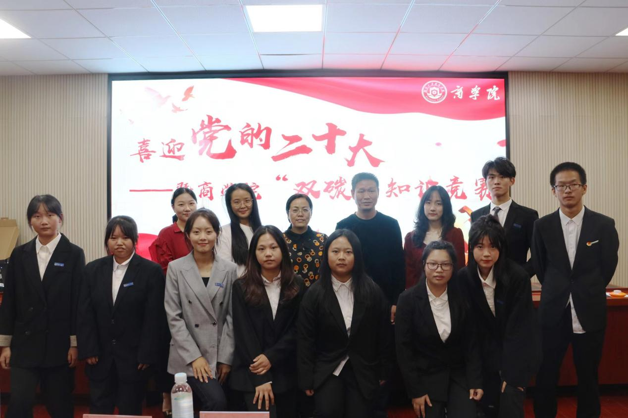 为庆祝党的二十大顺利召开,贯彻落实“双碳”目标,增加师生科技素养,10月21日晚,经管楼302举办了商学院首届“双碳”知识竞赛决赛。商学院院长王小兵、党委副书记赵晓军、副院长朱纪红、黄飞、学工办主任兼分团委书记段思遥、工商管理教研室教师代表邹斯婕、全体辅导员及学生代表出席。
