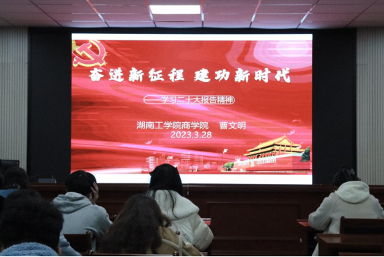 为深入学习贯彻党的二十大精神,强化思想政治引领,促进党建与教育教学工作深度融合,3月28日,商学院在经管楼302报告厅举行专题党课暨学生干部专题培训。商学院党委书记曹文明、学工办主任段思遥、全体辅导员、学生干部及党员代表参与本次培训。
