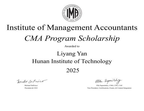 2012年起,IMA(美国管理会计师协会)在中国设立CMA奖学金项目,已与国内100多所高校合作,累计向2800多名学生提供超1600万元奖学金支持,激发学生对财务会计学习兴趣,积极引导优秀学生从事管理会计行业此次,IMA协会授予学院3名同学CMA奖学金,彰显其对我院管理会计人才培养效果的肯定和认可。