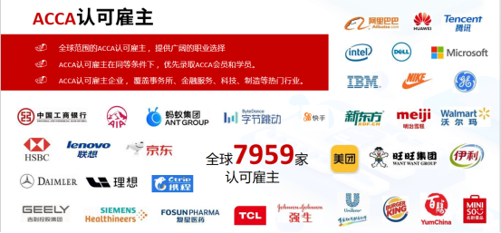 ACCA职业资格证书在全球范围内受到广泛认可:全球认可雇主7959家,国内认可雇主近800家。雇主覆盖金融服务、会计师事务所、通讯科技、生产制造等行业的世界500强企业。在同等条件下,雇主会优先录用ACCA学员或会员。