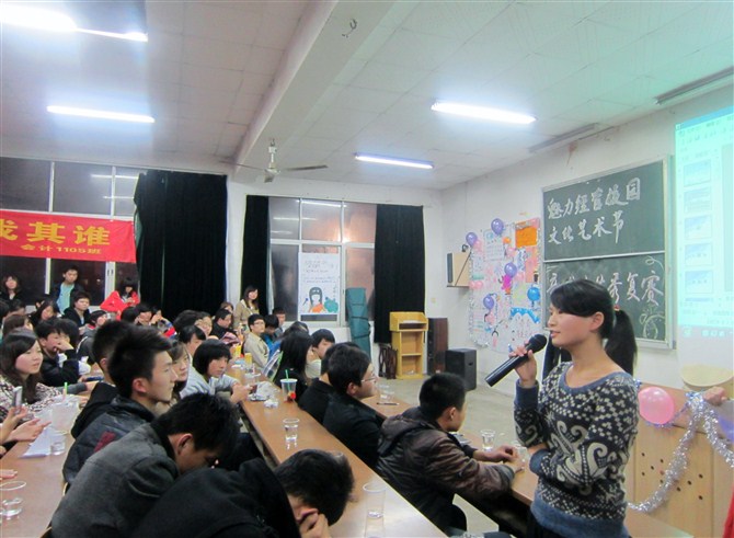 2011年10月28日晚7点,魅力经管校园文化艺术节新生才艺秀复赛在T2教室举行。担任本次竞赛评委的有学生会主席团各成员及各部门部长、青协会长及上届新生才艺秀获奖选手。