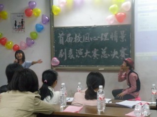 2011年 5月23日下午七时许,由经管系承办的学院首届校园心理情景剧表演大赛总决赛在南校区T1教室拉开序幕。本次大赛的评委及嘉宾经管系党总支书记袁勤、副书记黄春喜、院心理咨询章红英老师。计信系周艳红老师、材化系申杰文老师、机械系冯志敏老师、经管系舒畅、聂添、张勇、刘刚老师以及各系团总支学生分会学生代表近300人参加了此次大赛。