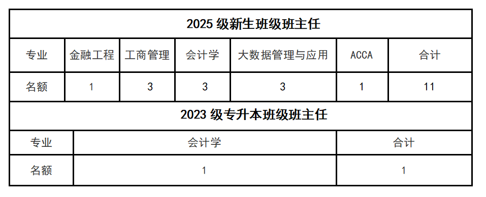 根据2025级新生和2023级专升本学生人数、编班情况,每个班级选聘1名班主任,拟选聘12名。