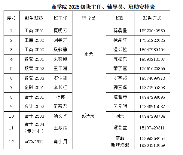 根据《关于公开选聘2025级新生和2023级专升本班级班主任的通知》和《商学院关于选拔2025级新生班级班助及2023级专升本班级专项助理的通知》,经个人申请,学院审核,选聘工作领导小组审议,现将商学院2025级新生和2025级专升本班级班主任、2025级新生和2025级专升本班级班助名单公示如下: