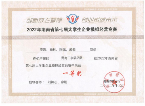 省级优秀指导教师(政府类):2人次,刘锦志(企业经营模拟)、刘锦志(酒店管理商业策划) 省级优秀指导教师(榜单类):4人次,黄飞、张诗菡、刘锦志、朱送花(学创杯) 省级优秀组织奖(政府类):企业经营模拟大赛、电子商务大赛、财务大数据应用能力竞赛 |