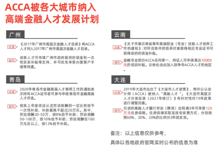 ACCA获取全国21省市逾30项人才激励政策,如现金奖励、积分落户、创新创业、一次性安家补贴、购房契税减免、车辆购置税减免等。目前,包括北京、上海、广州、深圳、长沙、重庆、西安、厦门、青岛、成都、南昌、大连、宁波、武汉在内的各大城市已将ACCA人才纳入高端人才发展目录,或作为重点引进培养对象。“一带一路”政策下,传统行业升级,企业哄抢国际人才。ACCA人才市场需求量大,职业发展前景广阔。