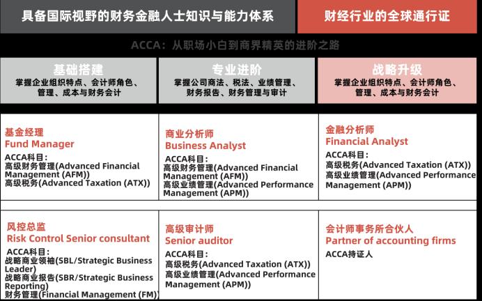 ACCA知识体系科目覆盖面广,未来职业选择更多元、方向更清晰。会计学专业ACCA教学班的学生未来将拥有广阔的就业选择,能在大型跨国公司、外资机构、会计师事务所、金融机构、政府部门等部门从事财务、审计、税务、商业分析、投融资、运营与管理等各类高薪职业。