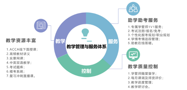 除了配备常规教辅老师负责日常教学与管理之外,本专业额外配备了专职班主任与学管老师,对同学们进行ACCA新学员注册/报考/备考等全过程细致辅导,并通过教学研讨会、每月课调、学服督学等措施严格把控教学质量,帮助学生高效完成各阶段学习任务,提高ACCA考试通过效率。