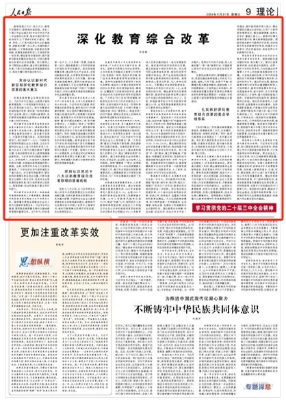 《决定》提出:“加快建设高质量教育体系,统筹推进育人方式、办学模式、管理体制、保障机制改革。”同时,就深化教育综合改革提出了一系列重点举措。我们要认真贯彻落实党中央决策部署,求真务实抓落实、敢作善为抓落实,实现教育系统性跃升和质变,为推进中国式现代化提供全方位的人才支撑、智力支持。