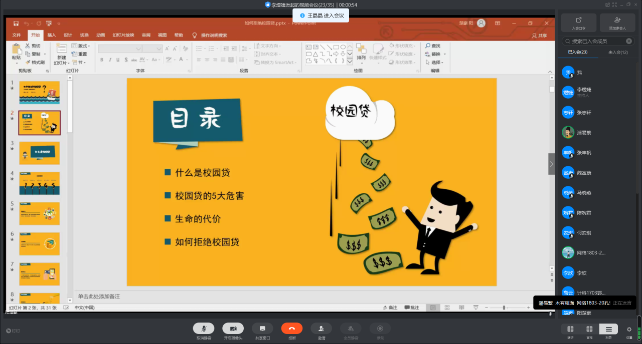 会议主持人带领大家一起了解了防范非法集资知识。首先就对什么是校园贷的基本常识作出讲解,包括电商平台,金融公司,网贷平台,线下私贷,银行机构等。紧接着对校园贷的5大危害进行讲解,其危害包括“低利息”不可信;越便捷,越易变“劫”;一旦逾期,催款“全方位”;易滋生恶习。最后主持人就如何拒绝校园贷,做出重要讲解,并播放了防范非法集资知识宣传短视频来提醒同学远离校园贷。