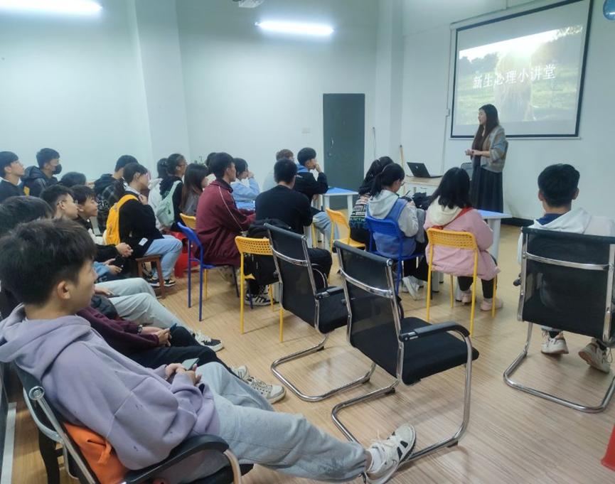 团委学生会心理健康部随即开展了“新生心理小讲堂”进班级活动。在班级中宣讲心理健康对大学生的重要意义、五类大学生常见的心理问题以及事发压力的有效小妙招。宣讲过程中还穿插了趣味横生的心理小测试,讲堂气氛热烈,现场轻松愉快。