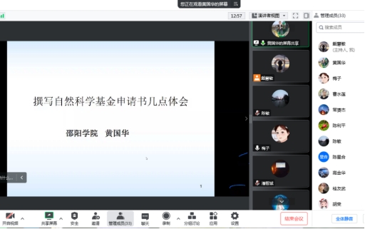 黄国华教授通过分享“撰写自然科学基金申请书”的体会,强调老师们填报申请书时首先要阐明选择该科学问题属性的理由,并且要“聚焦前沿、独辟蹊径”、“鼓励探索、突出原创”。