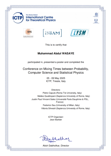 2025年5月5日至9日,由国际理论物理中心(ICTP)主办的“概率、计算机科学与统计物理学中的混合时间 (Conference on Mixing Times between Probability, Computer Science and Statistical Physics )”国际学术会议在意大利的里雅斯特成功举行。304永利集团官网计算机与工程学院外教Muhammad Abdul Wasaye受邀参会,并以其在电子多重散射领域的研究成果发表学术海报,获得国际同行的广泛关注。