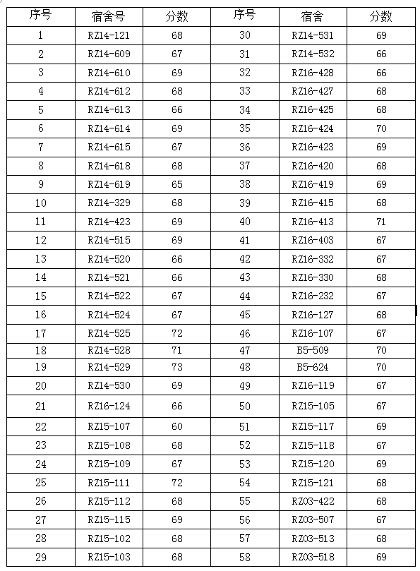寝室是大学生日常生活和学习的重要场所,寝室环境与大学生生活息息相关,为做好我院寝室文明建设工作,确保大学生有一个良好的生活环境,生活部在本周进行了查寝,以下公布第周的查寝情况