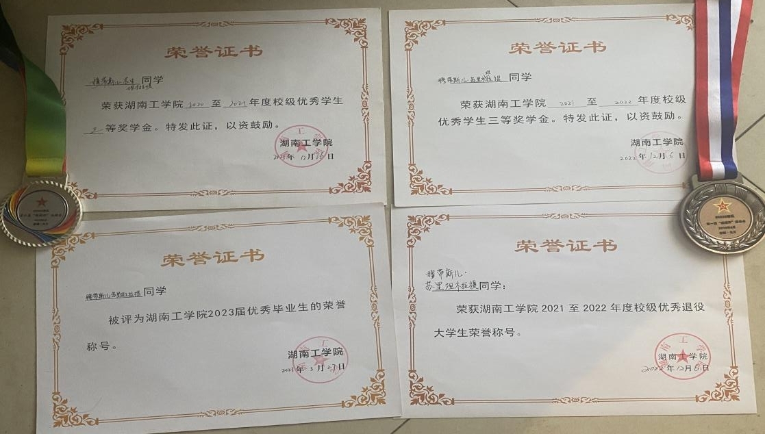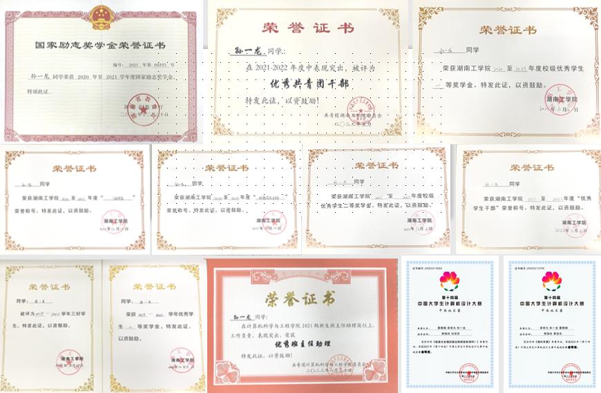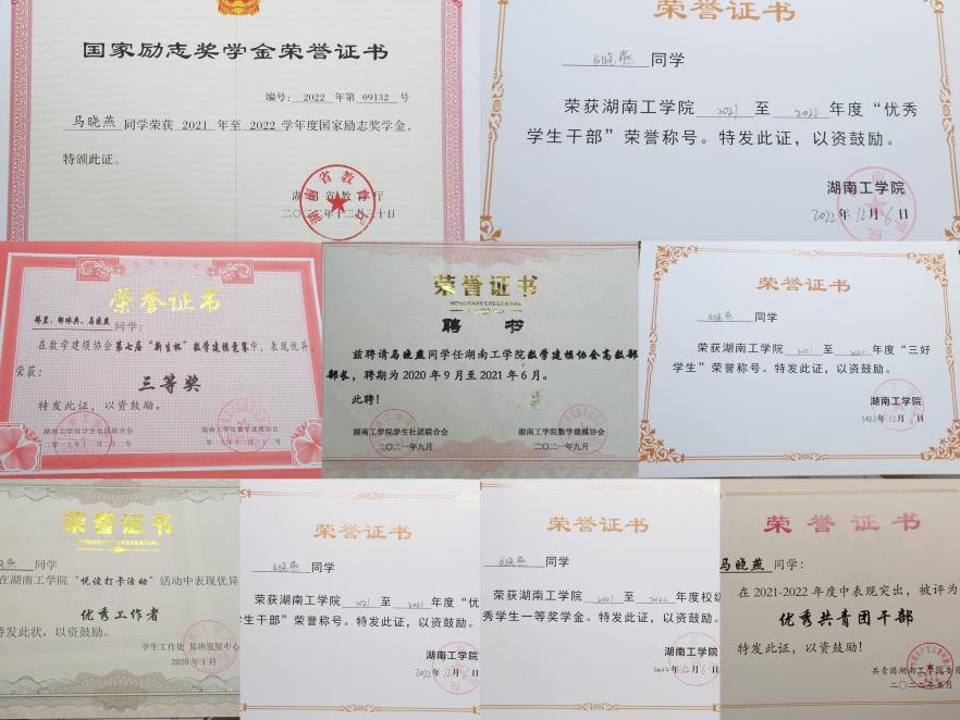 在校期间荣获国家励志奖学金3次、校级优秀学生二等奖学金3次、校级优秀学生干部3次、校级优秀共青团员1次、校级优秀共青团干部1次,担任304永利集团官网资助宣传大使,参与组织衡阳市“2021春祭|请抗战忠魂检阅青春”,并荣获衡阳市优秀志愿者称号。