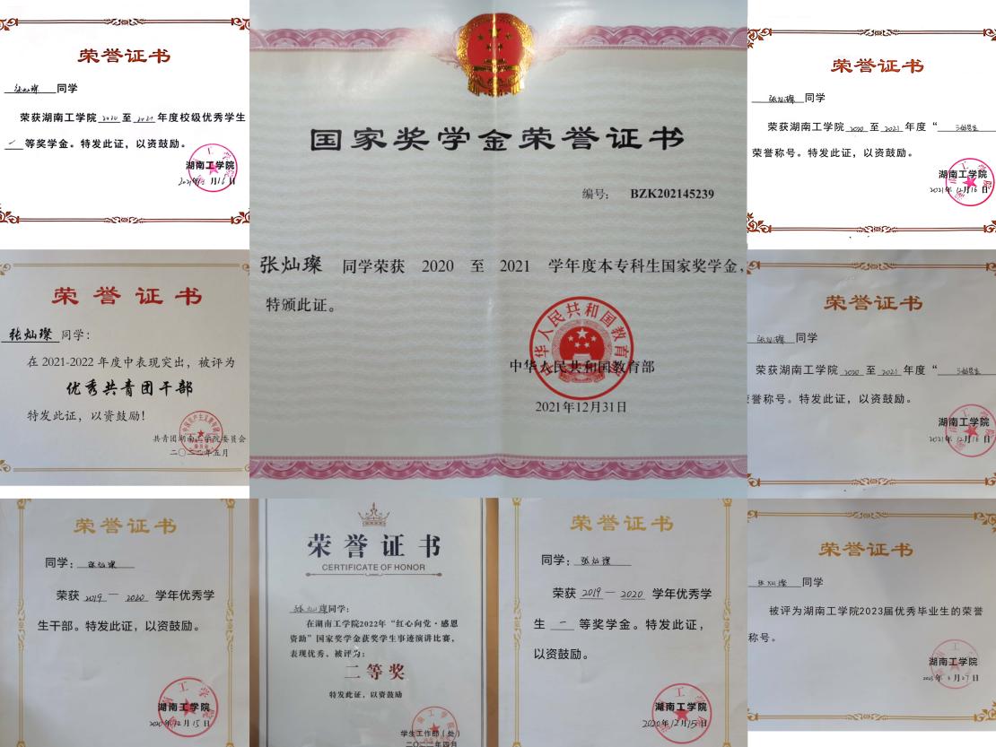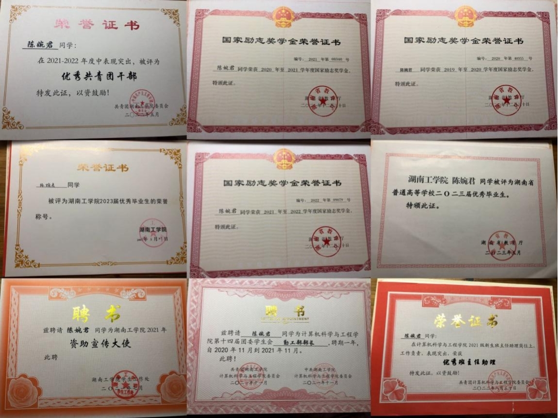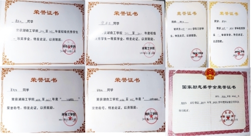 在校期间连续三年总成绩均为专业前三,荣获国家励志奖学金3次、校级一等奖学金2次、校级二等奖学金1次、校级三好学生2次、校级优秀学生干部2次、校级优秀团员干部1次、校级优秀团员2次、优秀班委4次。