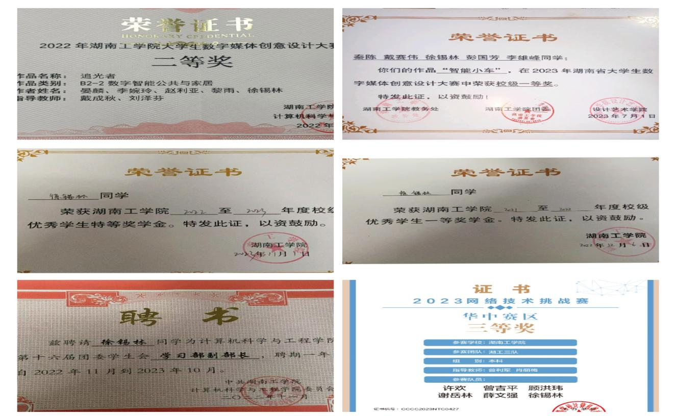 在校期间荣获国家励志奖学金1次、校级一等奖学金1次、校级优秀学生干部1次、校级优秀共青团员1次、优秀班干部1次,综合成绩排名专业第一。曾参加第十六届中国大学生计算机设计大赛获中南赛区三等奖,在学院工作期间,热心服务同学,荣获团委学生会“优秀工作者”称号。