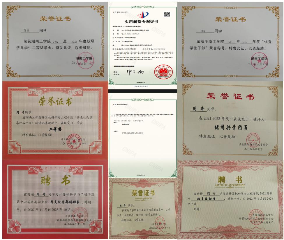 在校期间多次获得校、院级荣誉,荣获国家励志奖学金1次,校级二等奖学金1次,校级优秀学生干部1次,校级优秀共青团员1次。获得国家实用新型专利。在校期间参加互联网+,大创等多项比赛并获得相关荣誉。在学院工作期间,热心服务同学,多次获得“优秀工作者”称号。