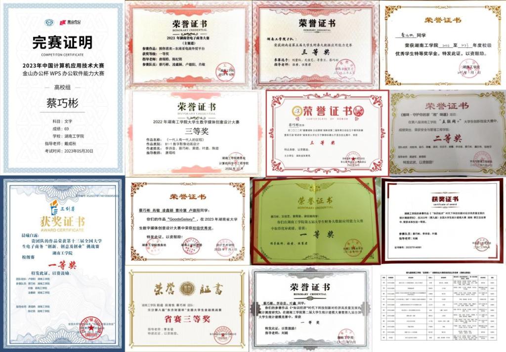在校期间荣获国家励志奖学金1次、校级一等奖学金1次、校级优秀三好学生1次、校级优秀共青团员1次、优秀班干部1次,学习成绩排名第一,综合成绩排名专业第一。在校期间积极参加比赛活动,曾获得省级奖项荣誉1次、校级奖项荣誉6次。