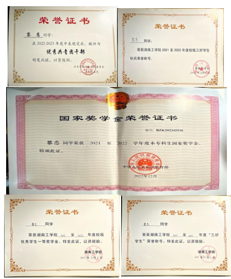 在校期间多次获得省、校级荣誉,荣获国家励志奖学金2次、校级一等奖学金2次、校级三好学生2次、校级三好学生标兵1次、校级三下乡优秀个人2次、校级优秀共青团干部1次、校级优秀共青团员1次。