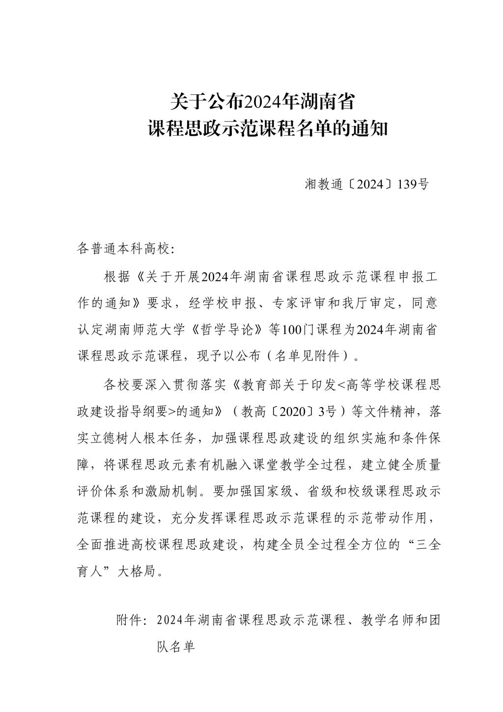 湘教通〔2024〕139号 关于公布2024年湖南省课程思政示范课程名单的通知