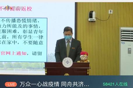 校长罗建华教授以“万众一心战疫情,同舟共济度时艰”为题,他首先介绍了习近平总书记关于打赢新冠肺炎阻击战的总体部署,讲述了在抗疫期间涌现出的典型人物,增强了学生的爱国主义教育;然后,讲授了在疫情期间常见的心里疾病,并提出了具体的解决办法以及学校网络心理援助服务,加强了学生心理健康的疏导;接着,讲授了新冠肺炎病毒防控措施以及永利防控期间的教学安排;最后,针对疫情期间的学生学习进行深入指导,确保学生学习质量不降低。