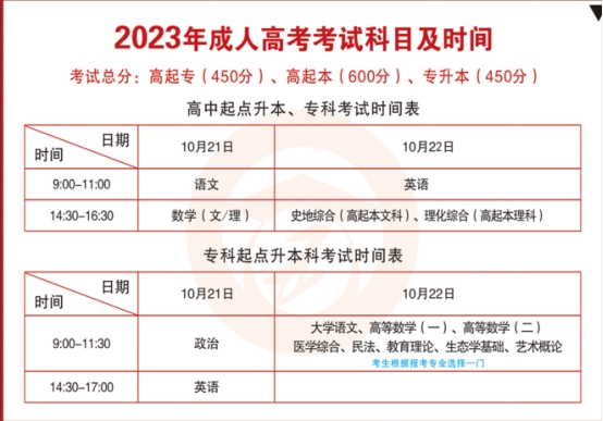 各校外教学点及各位考生,2023年成人高考时间是:10月21-22两天,准考证打印时间是:10月16-22日。请各站点做好考前辅导,提醒学生按时打印准考证,按时参加考试。