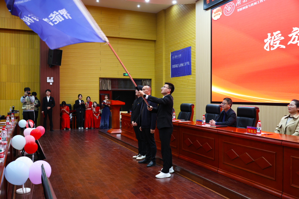 旗帜猎猎,薪火相传。第十八届学生会执行主席李康康从刘斌书记手中接过会旗,并作任职发言。第十八届院团委学生常务副书记高源辰带领新一届团委、学生会全体成员进行就职宣誓。