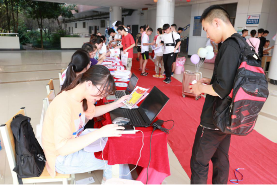 迎新期间,为简化新生报到手续,更好地为新生入学提供优质服务,学院安排了学生志愿者引导新生报到,领取生活用品、办理饭卡、入住宿舍等,新生们在这些学长、学姐们的陪同、帮助下,享受“定点迎接——报到点报到——寝室入住”的“一条龙”服务。而最为贴心细致的是,我们不仅将报名流程贴在报名入口,而且还有很多温馨小提示,例如:“不要忘了拍照保存自己的宿舍和教室信息”等等,让人一目了然,心里十分温暖。