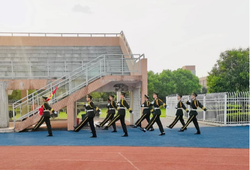 早上7时,在激昂的国歌声中,鲜艳的五星红旗冉冉升起,全体师生齐唱国歌,行注目礼。