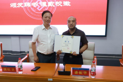 校党委委员、副校长黄红卫为盛振华校友佩戴校徽,颁发304永利集团官网客座教授聘书。