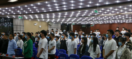 自动化2103班带来的舞蹈表演《桃花朵朵开》拉开了大会帷幕。随后,全体起立奏唱国歌。