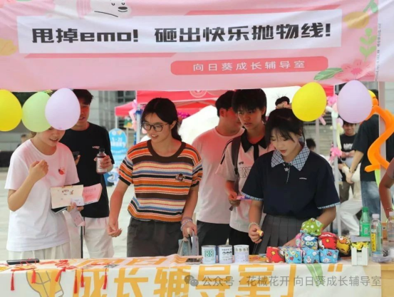 活动现场,氛围热烈而欢快。心理游园会设置了丰富多样的趣味项目,“情绪投掷赛”吸引了众多同学参与。同学们通过投掷特制的情绪骰子,分享自己当下的情绪感受,在轻松的互动中,增进对自身及他人情绪的理解。现场还设有“甩掉 emo!砸出快乐抛物线!”区域,同学们可以通过击打道具等方式,释放压力,甩掉负面情绪。