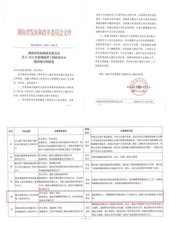 近日,湖南省发改委下发了《关于2020年度湖南省工程研究中心建设项目的批复》(湘发改高技[2020]1006号),永利机械工程学科联合衡阳华菱钢管有限公司和鸿大特种钢管股份有限公司申报的,由吴远志博士担任中心主任的“特种钢管深加工技术湖南省工程研究中心”获批立项。