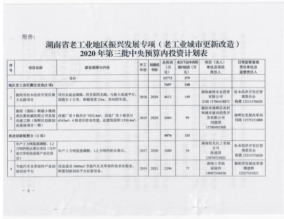 近日,根据《湖南省发展和改革委员会关于分解下达老工业地区振兴发展专项(老工业城市更新改造)2010年第一批中央预算内投资计划的通知》(湘发改投资[2010]183号)、《湖南省发展和改革委员会关于分解下达老工业地区振兴发展专项(老工业城市更新改造)2010年第二批中央预算内投资计划的通知》(湘发改投资[2010]331号)和《湖南省发展和改革委员会关于分解下达老工业地区振兴发展专项(老工业城市更新改造)2010年第三批中央预算内投资计划的通知》(湘发改投资[2010]479号)精神,永利节能汽车及零部件产业创新创业平台获得资金支持695万元(第一批487万元,第二批131万元,第三批77万元)。