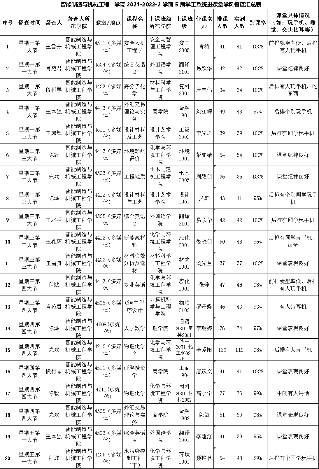 智能制造与机械工程学院2021-2022-2学期第5周学工系统进课堂学风督导情况